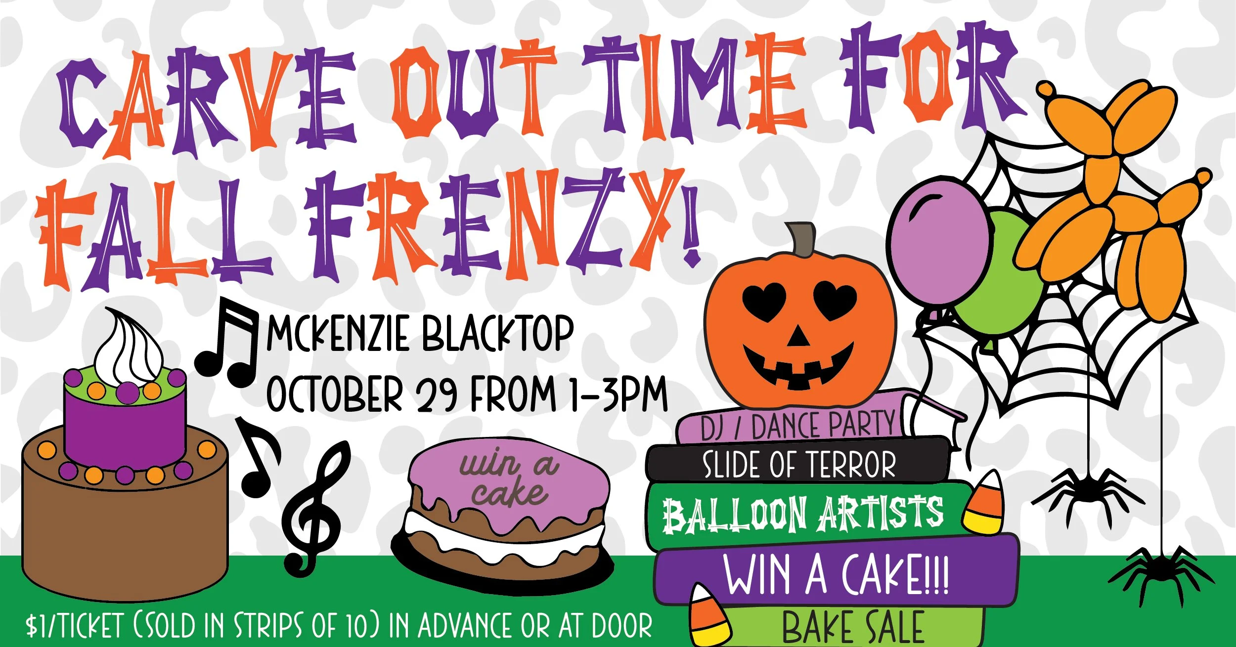 McKenzie's Fall Frenzy will be Saturday, October 29th from 1:00pm - 3:00 pm. The event will be held OUTSIDE on the blacktop and field, so dress accordingly. We will move inside if it rains or snows.
